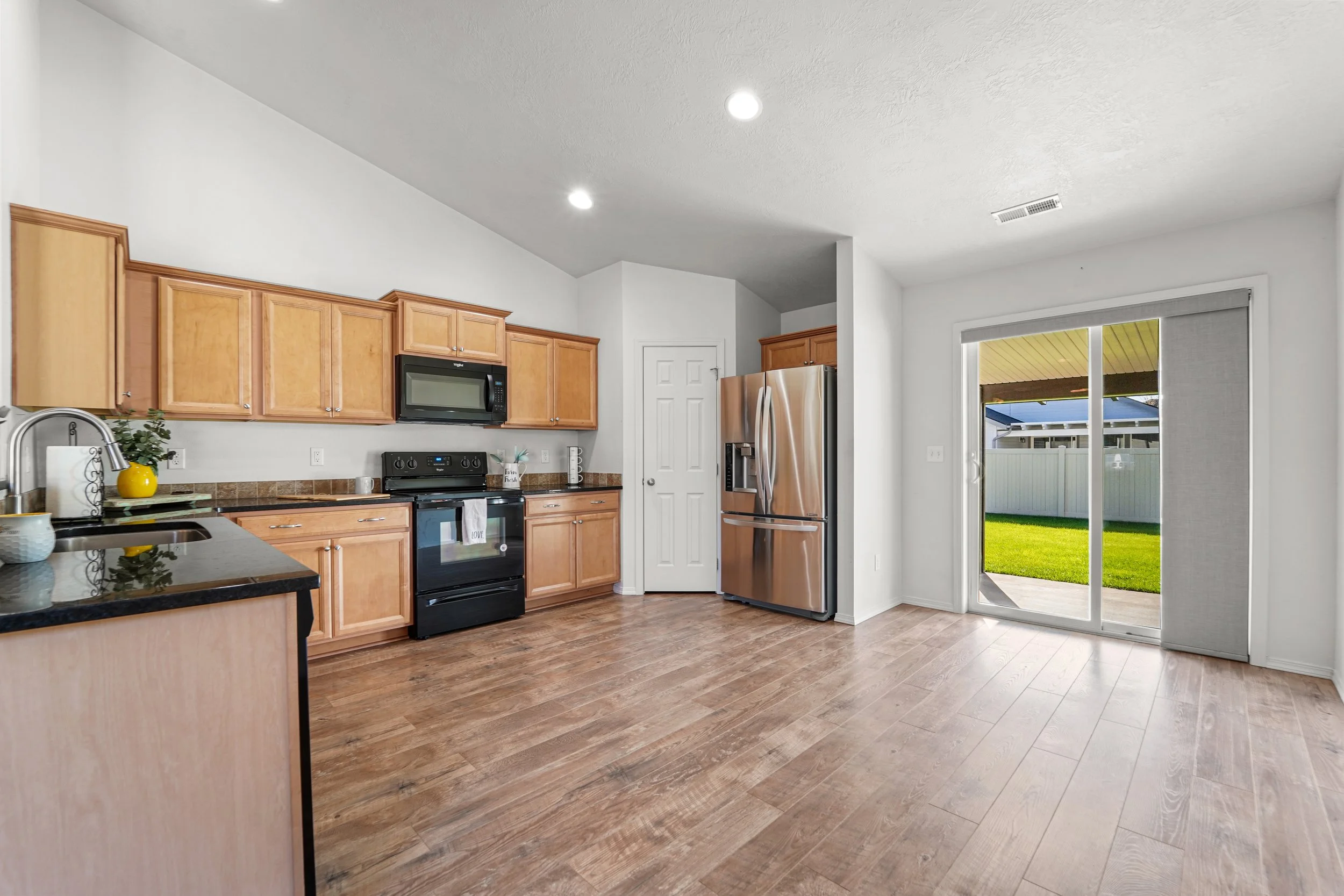 This charming 3-bedroom, 2-bathroom home, built in 2018, blends modern comfort with a bright and inviting design. Step inside to soaring vaulted ceilings and an open layout that creates a spacious feel throughout. The kitchen is a standout with granite countertops, a breakfast bar, and plenty of room to gather. The private master suite offers a walk-in shower and a generous walk-in closet, creating a comfortable retreat. Outside, enjoy a large backyard with a covered patio, perfect for barbecues, relaxing, or entertaining. A welcoming covered front porch adds curb appeal and a cozy spot to unwind. Perfectly located in North Nampa’s Franklin Village subdivision, this home is just steps from Orah Brandt Park, where you’ll find playgrounds, a splash pad, pickleball courts, Frisbee golf, a baseball field, walking paths, and wide open green spaces to enjoy. Don’t miss the chance to own this beautiful home in a prime location.