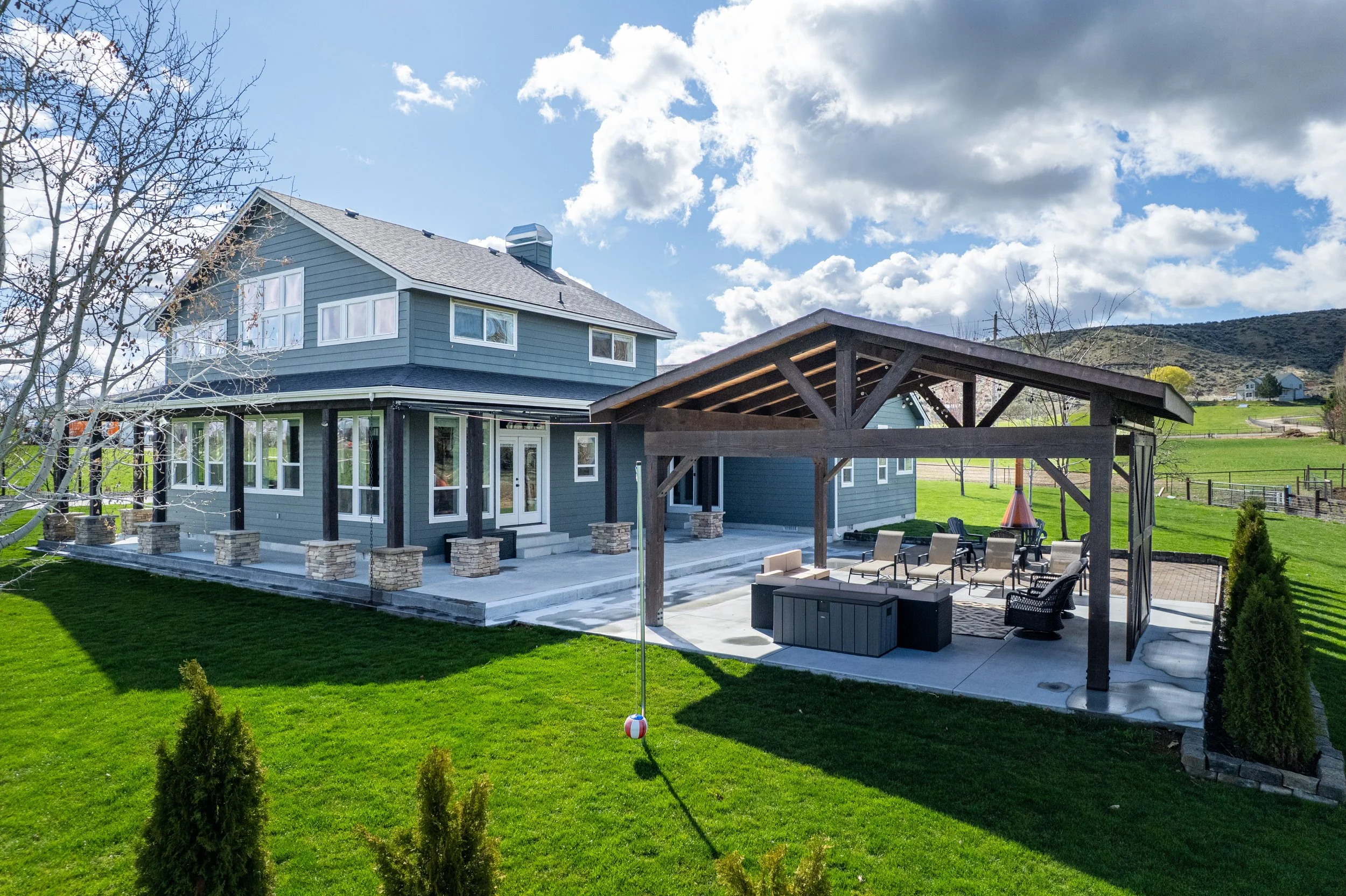 Discover the perfect blend of comfort, privacy, and functionality with this stunning single-story home, set on 5.78 acres situated next to thousands of acres of BLM land and surrounded by breathtaking views. A private gated entrance welcomes you to this serene property. Bring your horses, chickens, boats, and RVs, with plenty of space for parking and outdoor enjoyment. Inside, you'll find a brand-new, beautifully designed home with vaulted ceilings, split floorplan, LVP flooring, and new appliances, including a brand new refrigerator and dishwasher. The open-concept is perfect for entertaining, while French doors lead you to a backyard oasis featuring a hot tub and covered pergola ideal for relaxing under the stars. Start your mornings or unwind your evenings on your covered front porch, warmed by the firepit while taking in the incredible views. This acreage qualifies for the ag-exemption with an alfalfa/grass hay mixture farm. Also included are 3 sheds 12x16 with electricity, 14x24 and 8x10. No HOAs/CCRs